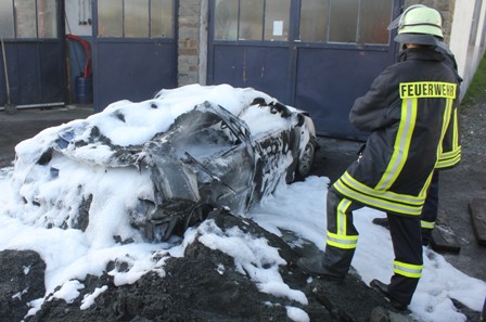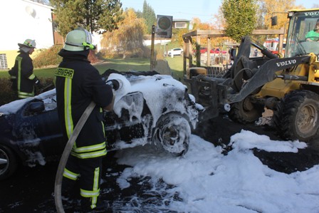 Bei einem Fahrzeugbrand in der Ortschaft Forstmehren wurde eine männliche Person erheblich verletzt. Kurz nach 15 Uhr war in einer Werkstatt in Forstmehren bei Zerlegungsarbeiten eines Kleinwagens ein Feuer ausgebrochen. Mit einem Gabelstapler wurde das Fahrzeug brennend aus dem Haus geholt und anschließend versucht das Feuer mit festem Straßenbaumaterial zu löschen. Von der Leitstelle Montabaur waren die Löschzüge Mehren und Weyerbusch alarmiert worden. Beide Löschzüge rückten Minuten später an und vollendeten die Löscharbeiten. Das Fahrzeug wurde komplett mit Löschschaum ausgefüllt und abgedeckt. Die am Fahrzeug tätige Person erlitt, so die ersten Informationen, schwere Verbrennungen an den Händen und Unterarmen. Neben den Mitgliedern der Löschzüge Mehren und Weyerbusch waren die beiden Verbandsgemeinde Wehrleiter Ralf Schwarzbach und Andreas Krüger, die Polizei Altenkirchen sowie der DRK Rettungsdienst und ein Notarzt. (wwa) Fotos: Wachow